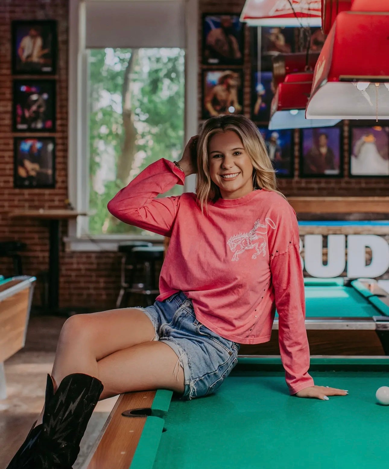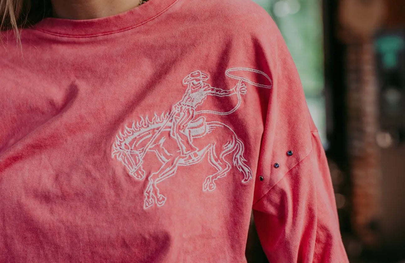 Check out our Pink Acid Washed Embroidery Studded Long Sleeve Bucking Cowboy Crop Tee! Perfect for the cooler weather in the summer nights.